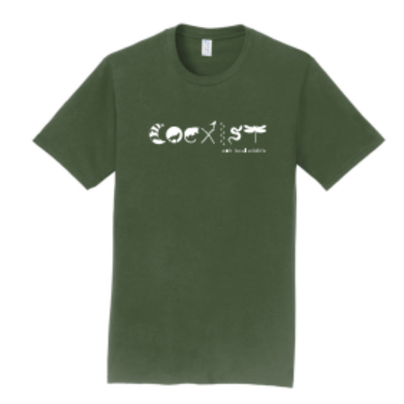 Raise awareness for wolves in style with this "Coexist" T-shirt! This PORT & COMPANY t-shirt is available in olive green (100% cotton) with our "Coexist" graphic on the front, and a small white WCC logo on back.