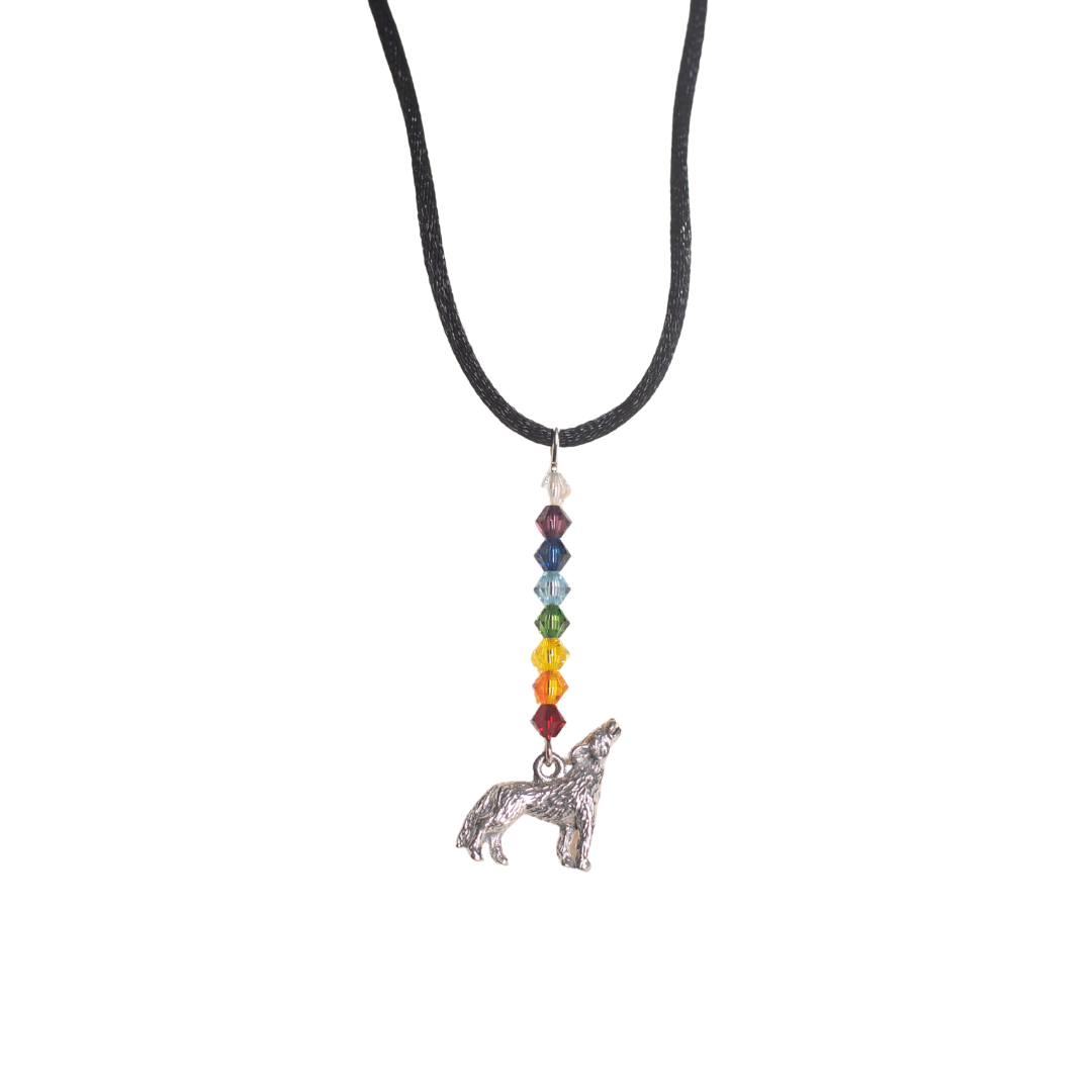 Swarovski crystal beads and pewter wolf charm necklace, finished with a silver-plated lobster clasp. The rainbow colored beads are topped with a clear, iridescent bead which reflects subtle glints of color when light strikes it. . Colors of the beads can be customized with orders of 12 or more. Designed by Kathy Rothfeld of Kasaro Designs in South Salem.