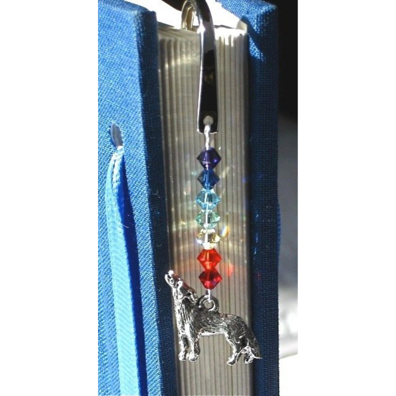Designed by South Salem's Kathy Rothfeld, this elegant shepherd's hook bookmark features a lead-free pewter howling wolf charm playfully dangling from Swarovski crystal beads that display the colors of the rainbow.