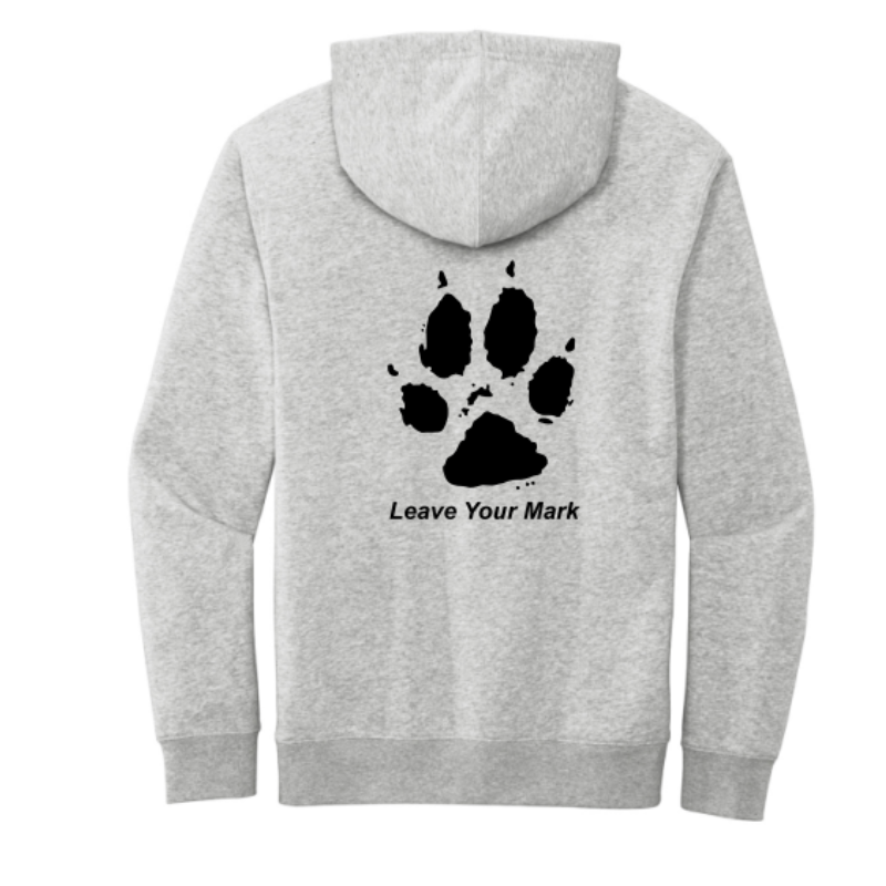 Raise awareness for wolves in style with a "Leave Your Mark" hooded sweatshirt! This cotton/poly blend sweatshirt is remarkably soft with a drawstring hood, kangaroo pocket, ribbed cuffs and a waistband. This sweatshirt comes in heather gray and features a "Leave Your Mark" logo on the back, and a small WCC logo on the front left chest.